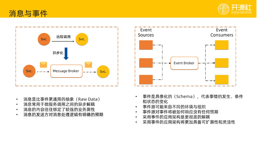 从用途来讲,消息往往用于微服务的异步解耦的架构。但这一块的话,事件驱动跟消息是稍微类似的。消息的应用场景往往发生在一个组织内部,消息的生产方知道这个消息要将被如何处理。比如说在一个团队里,消息的生产者跟发送者可能是同一个团队同一块业务,对这个消息内容有一个非常强的约定。相比之下,事件更加松耦合,比如说事件发送方也不知道这个事件将被投递到什么地方,将被谁消费,谁对他感兴趣,对事件被如何处理是没有任何预期的。所以说,基于事件的架构是更加解耦的。消息的应用往往还是脱离不了同一个业务部门,即使一些大公司里最多涉及到跨部门合作。消息的使用通过文档进行约束,事件通过 Schema 进行约束,所以我们认为事件是比消息更加彻底解耦的方式。