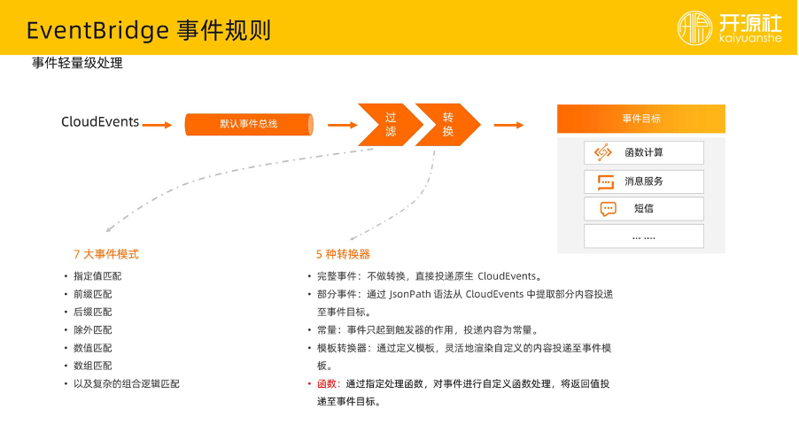 第二个部分就是事件总线,这是存储实体,事件过来,它要存在某个地方进行异步解耦。类似于说 RocketMQ 里面 topic 的概念,具备一定存储的同时,提供了异步能力。事件总线涵盖两种,一种默认事件总线,用于收集所有云产品的事件,另一种自定义事件总线就是用户自己去管理、去定义、去收发事件,用来实践 EDA 架构概念。第三部分就是规则,规则与 RocketMQ 的消费者、订阅比较类似,但我们赋予规则包括过滤跟转换在内的更多计算能力。第四部分就是事件目标即订阅方,对某事件感兴趣就创建规则关联这个事件,这其中包括函数计算、消息服务、HTTP 网关等等。