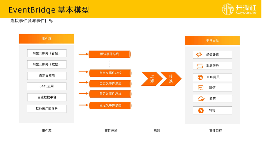 首先讲一下,EventBridge 基本模型,EventBridge 有四大部分。第一部分是事件源,这其中包括云服务的事件、自定义应用、SaaS 应用、自建数据平台。
