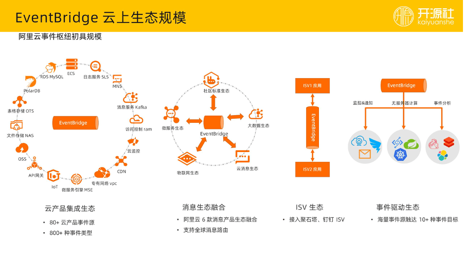 目前,EventBridge 集成了 80 多种云产品,约 800 多种事件类型,第一时间打通了消息生态,比如说 RocketMQ 作为一个微服务生态,我们去实践消息事件理念,就可以把 RocketMQ 的事件直接投递到 EventBridge,通过事件驱动架构去对这些消息进行处理,甚至 MQTT、KafKa 等消息生态,都进行打通集成。除了阿里云消息产品的打通,下一步也会把一些开源自建的消息系统进行打通。另一个生态就是 ISV 生态,为什么 ISV 需要 EventBridge?以钉钉 6.0 举例,其最近发布了连接器能力。钉钉里面要安装很多软件,这些软件可能是官方提供,也可能是 ISV、第三方开发者提供,这就造成数据的互通性差。因此,我们提供这个能力让 ISV 的数据流通起来。最后就是事件驱动生态,我们当前能够触达到大概 10 多种事件目标,目前也在持续丰富当中。