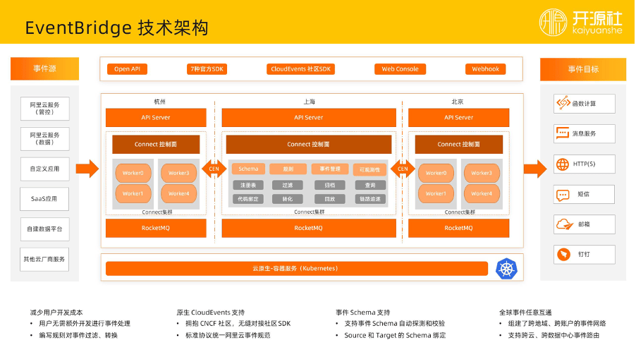 在更上面一层是 API Server,一个事件的入口网关,EventBridge 的世界里,摄入事件有两种方式,一种是通过 Connect 的 Source Connector,把事件主动的 Source 过来,另一种用户或者云产品可以通过 API server,通过我们的 SDK 把事件给投递过来。投递的方式有很多种,包括有 OpenAPI,有多语言的官方 SDK,同时考虑 CloudEvents 有社区的标准,EventBridge 也完全兼容社区开源的 SDK,用户也可以通过 Webhook 将事件投递过来。