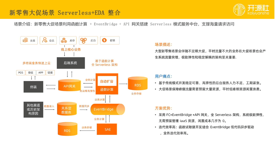 举一个简单的例子,就是基于 Serverless 加 EDA 的极简编程范式,再举一个具体的例子,新零售场景下 EDA 架构对这个业务进行改造。首先来讲,业务中有几个关键资源,可能有 API 网关、函数计算,首先可以去打通一些数据,打通 rds 并把 rds 数据同步过来,兼容一些历史架构,同时去触发计算资源、function、网关。整个架构优势非常明显,所以具备极致弹性能力,不需要去预留资源。
