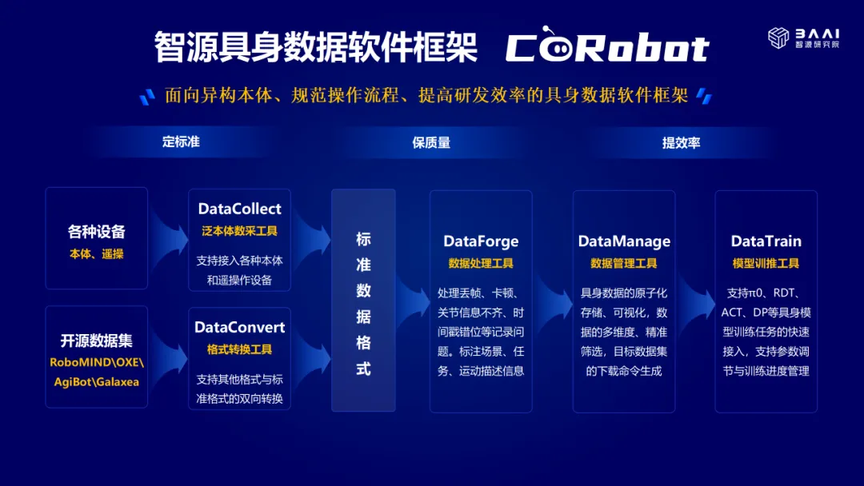 为了解决上述问题,智源研究院构建了一套“面向异构本体、规范操作流程、提升研发效率”的具身数据软件框架 CoRobot。借此实现了“定标准、保质量、提效率”的三大目标。