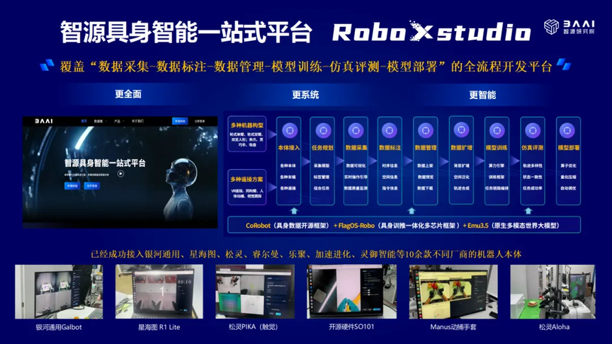 为全面提高具身智能研发效率,加速“数据 &模型”的循环迭代,智源研究院基于 CoRobot 具身数据开源框架、FlagOS-Robo 具身训推一体化多芯片框架、Emu3.5 原生多模态世界大模型,打造了具身智能一站式平台 RoboXstudio,能够覆盖数据采集-数据标注-数据管理-模型训练-模型评测-模型部署全流程。
