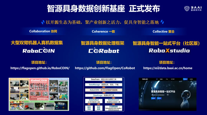 2025 年 11 月 20 日,北京智源人工智能研究院正式发布具身数据创新基座:智源具身一站式平台 RoboXstudio、大型高质量双臂机器人真机数据集 RoboCOIN、智源具身数据软件框架 CoRobot,推动了具身数据生产效率和质量的全面升级。