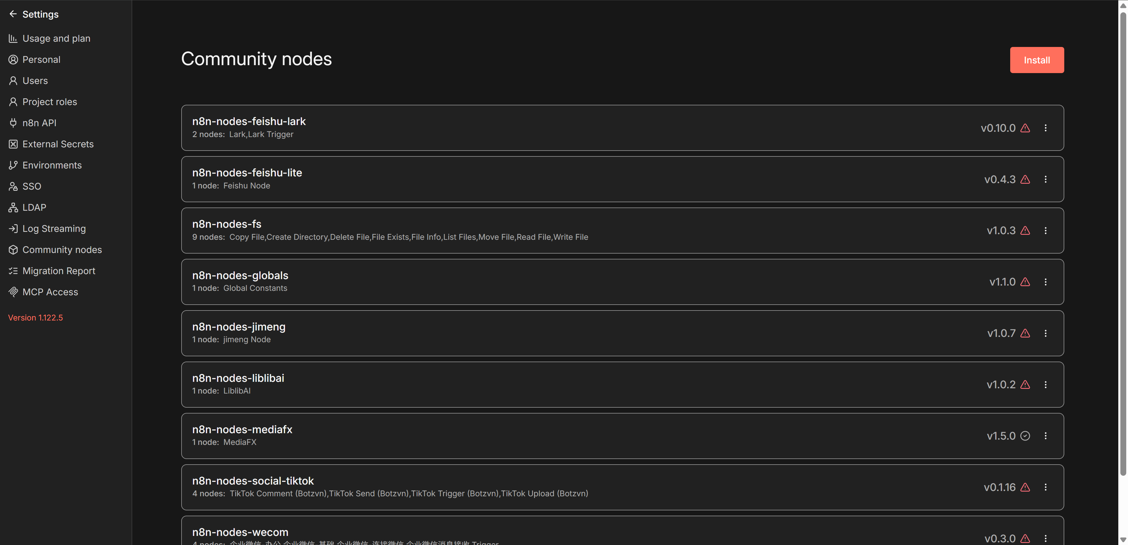 配置好并在 Docker 重启运行后,N8N 就能自动识别你所有的老插件了!大家可以去试试看。