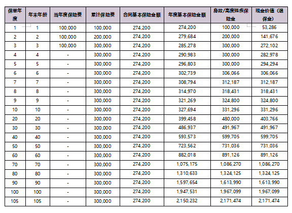 2.以上演示的“身故保险金”、“高度残疾保险金”和“现金价值”均为保险单年度末的数值。