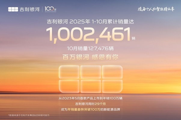 值得一提的是,截止今年 10 月,2025 年吉利银河年度累计销量已突破 100 万辆,达到 1002461 辆。自 2023 年 5 月吉利银河 L7 发布以来,吉利银河仅历时 29 个月,便实现年销百万,成为最快达成年销百万的新能源汽车品牌。吉利银河在每一个细分市场中,都为用户提供高质优价、超越期待的好产品,创造出了举世瞩目的“银河速度”,交出了一份年销百万、速度第一、中国唯二、全球前三的满意答卷,再度树立了全新销量里程碑。
