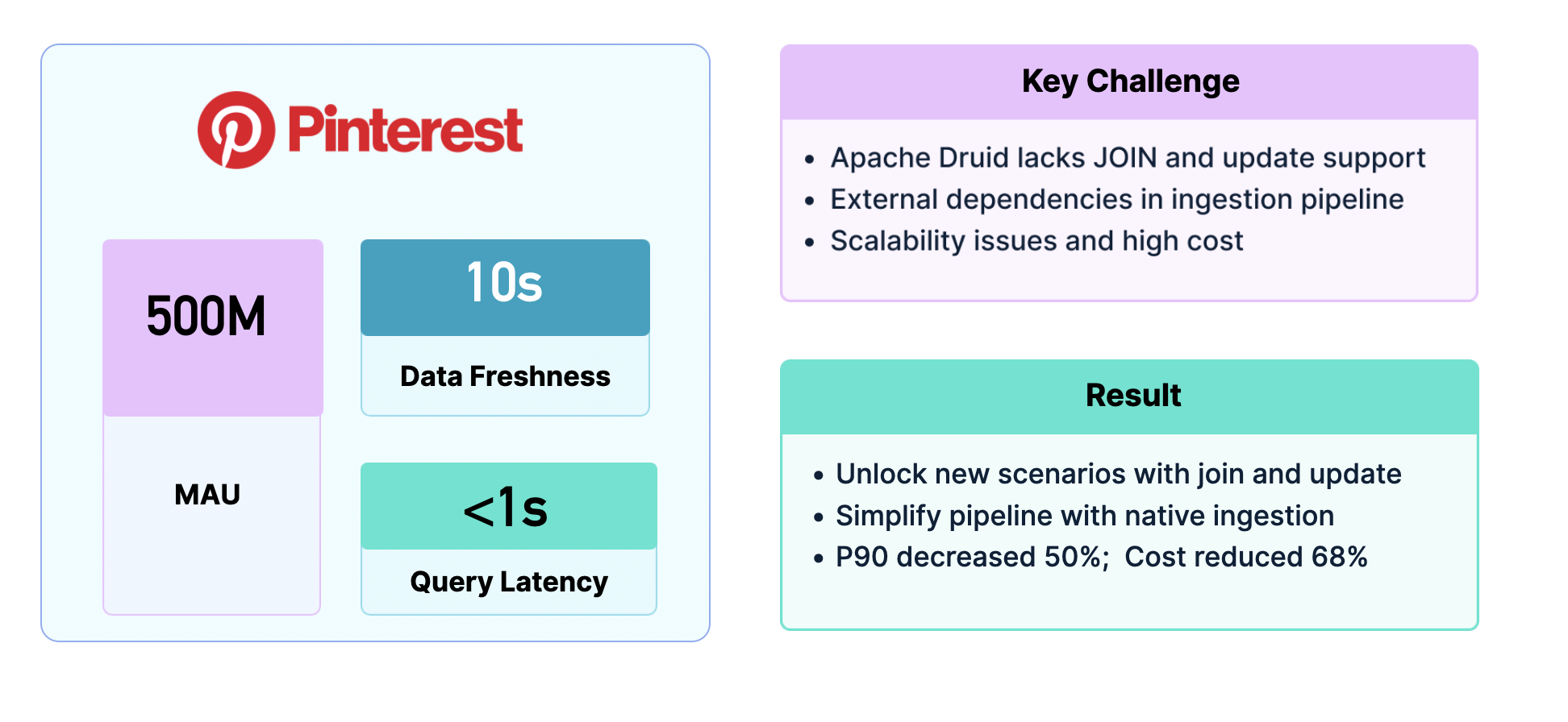 北美兴趣社交的领军企业 Pinterest,其广告平台面临极高的实时分析挑战:月活跃用户超过 5 亿,对数据新鲜度要求需在 10 秒以内,查询延时则需小于 1 秒。此前,Pinterest 使用 Druid,但由于在多表 Join 与 Update 支持上的限制,不得不依赖复杂的 Pipeline 构建大宽表,既增加了开发复杂度,也带来了稳定性和高成本的问题。