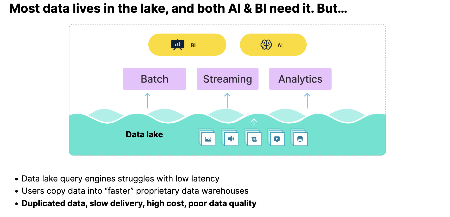 北美知名体育电商平台 Fanatics,其数据全部统一存储在 Iceberg 中。但在分析时,需要将数据导入 Redshift、Flink、Druid 等不同系统以支撑各类场景。这种方式不仅造成数据孤岛,难以关联,还带来了高昂的计算与存储成本,且难以满足实时分析需求。
