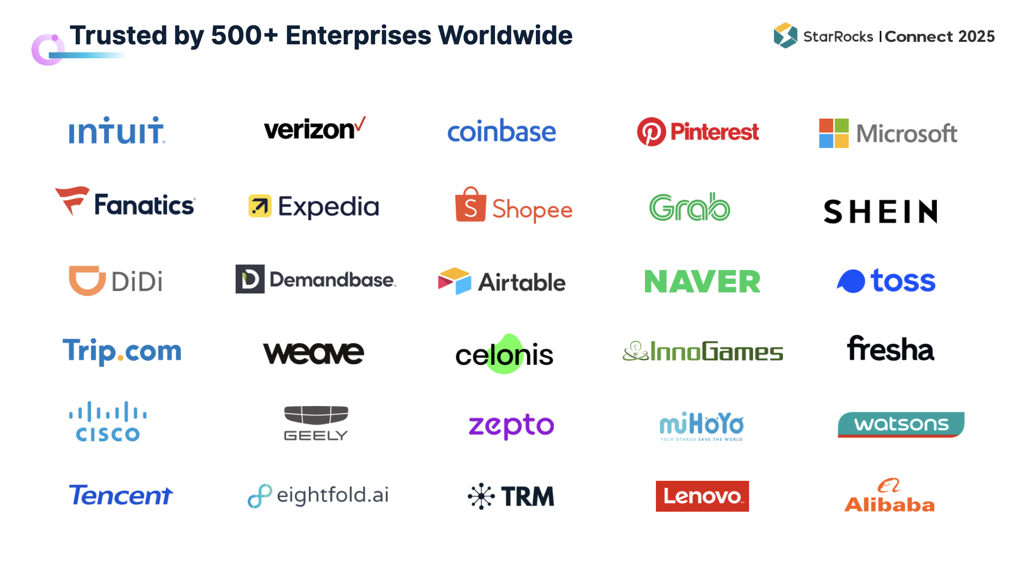 过去几年,StarRocks 得到了全球众多知名企业的广泛采用。仅我们直接接触到的,就有超过 500 家估值 10 亿美元以上的公司在使用 StarRocks,而在更广阔的开源社区中,实际用户数量远超这一数字。