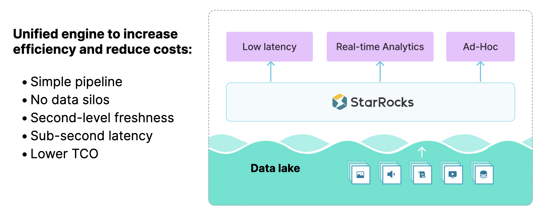 StarRocks 致力于成为统一的分析引擎,使数据在湖上即可支撑实时与离线的多样化场景。这样的统一带来诸多价值: