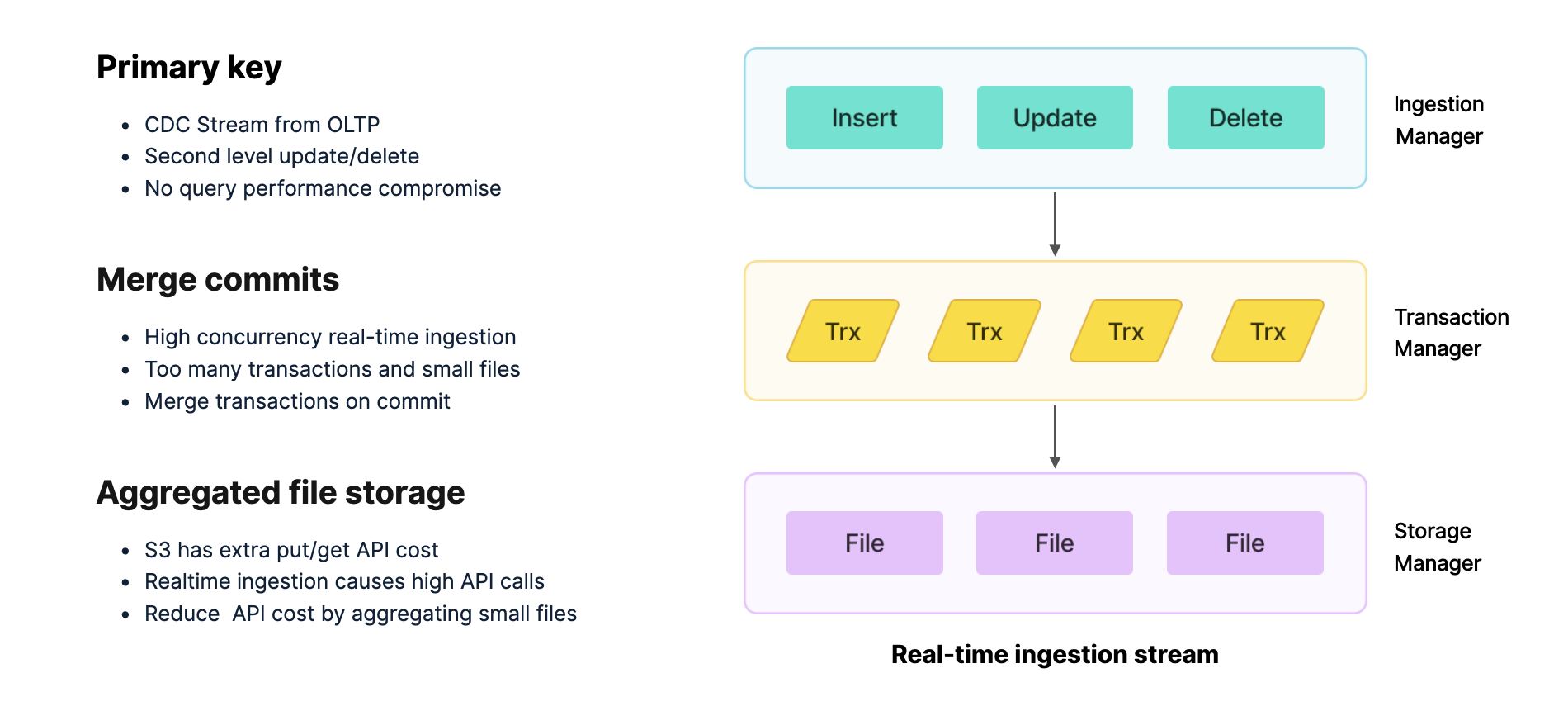 实时场景往往伴随高并发写入,这会给引擎带来巨大压力。为此,StarRocks 采用 Merge Commits 机制,在事务提交时对小事务进行合并,从而降低系统开销并提升整体写入性能。