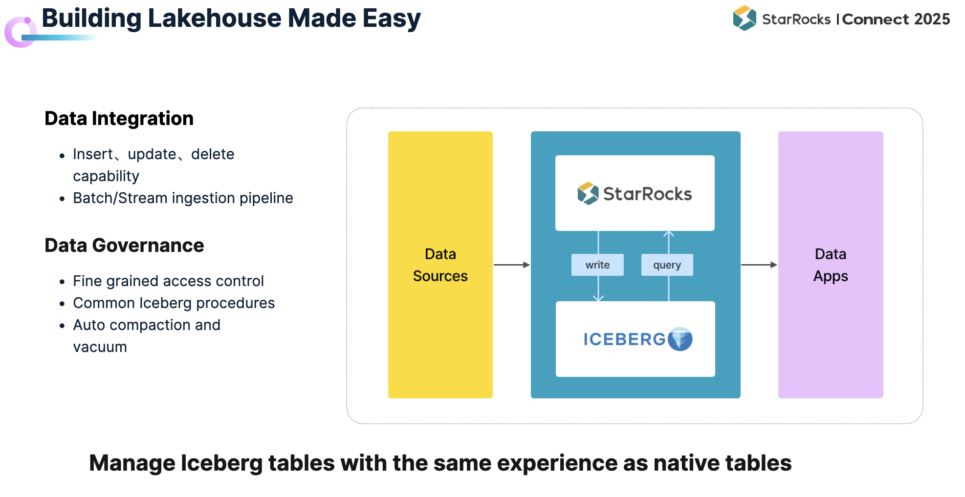 然而,数据湖不仅涉及查询,更是未来的整体趋势。当前,许多大型企业已在积极推进数据湖建设,但对于中型和小型企业而言,构建数据湖仍存在显著挑战:需要搭建完整的 Pipeline,还要承担数据写入与治理的复杂工作,其门槛远高于使用 StarRocks Native Table。