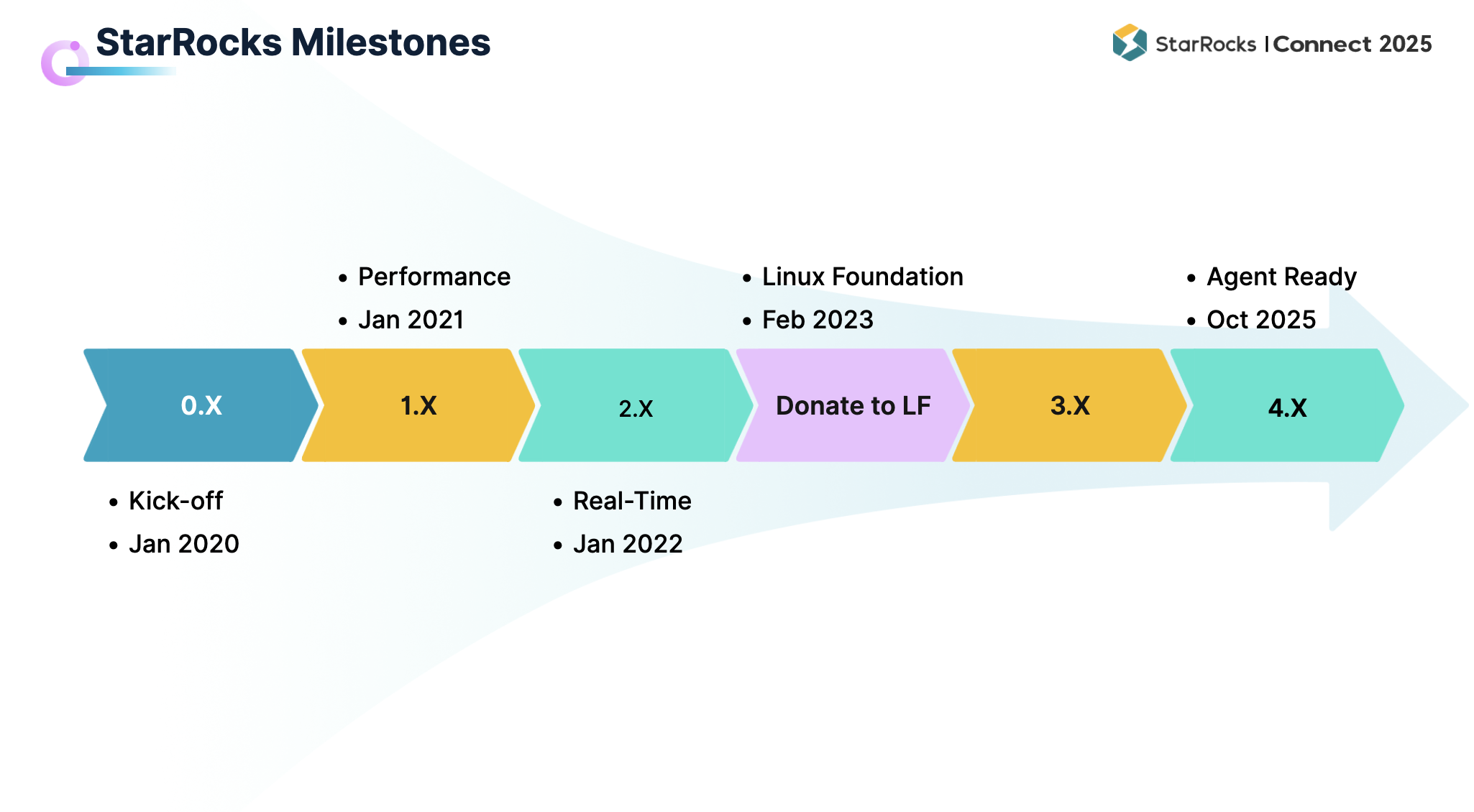 在过去五年中,StarRocks 始终保持着快速迭代。今年 10 月,StarRocks 即将发布 4.0 版本,至此已经完成了从 1.0 到 4.0 的四次重要升级。