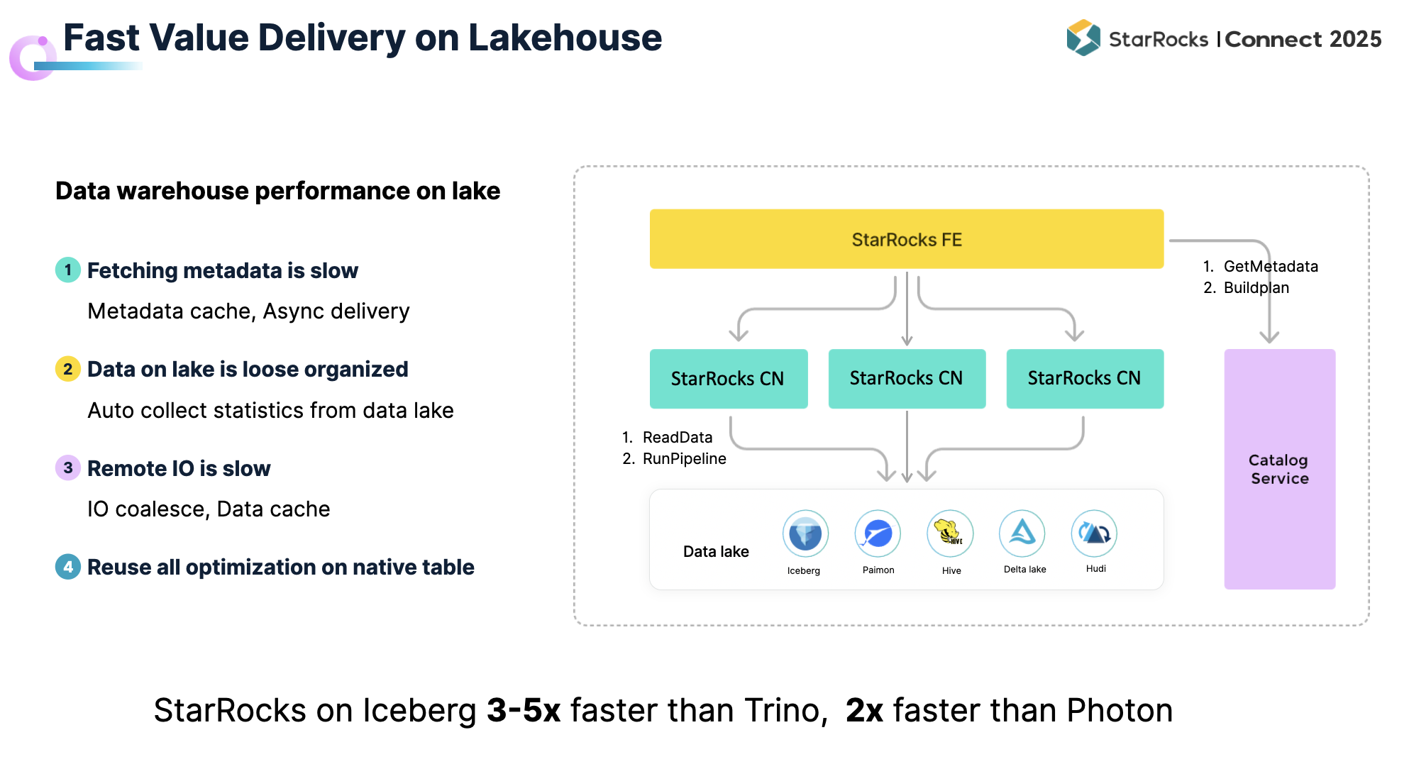 前文已从架构基础、持续迭代以及真实场景等角度阐述了 StarRocks 在高性能查询上的优化。结合 Lakehouse 的发展趋势,越来越多的数据被统一存储在数据湖中。此时,新的问题出现了:StarRocks 能否将其强大的分析引擎能力应用于湖上数据? 答案是肯定的。过去几年中,StarRocks 持续优化湖上数据的分析性能,使用户能够在数据湖中直接完成分析并快速交付价值。