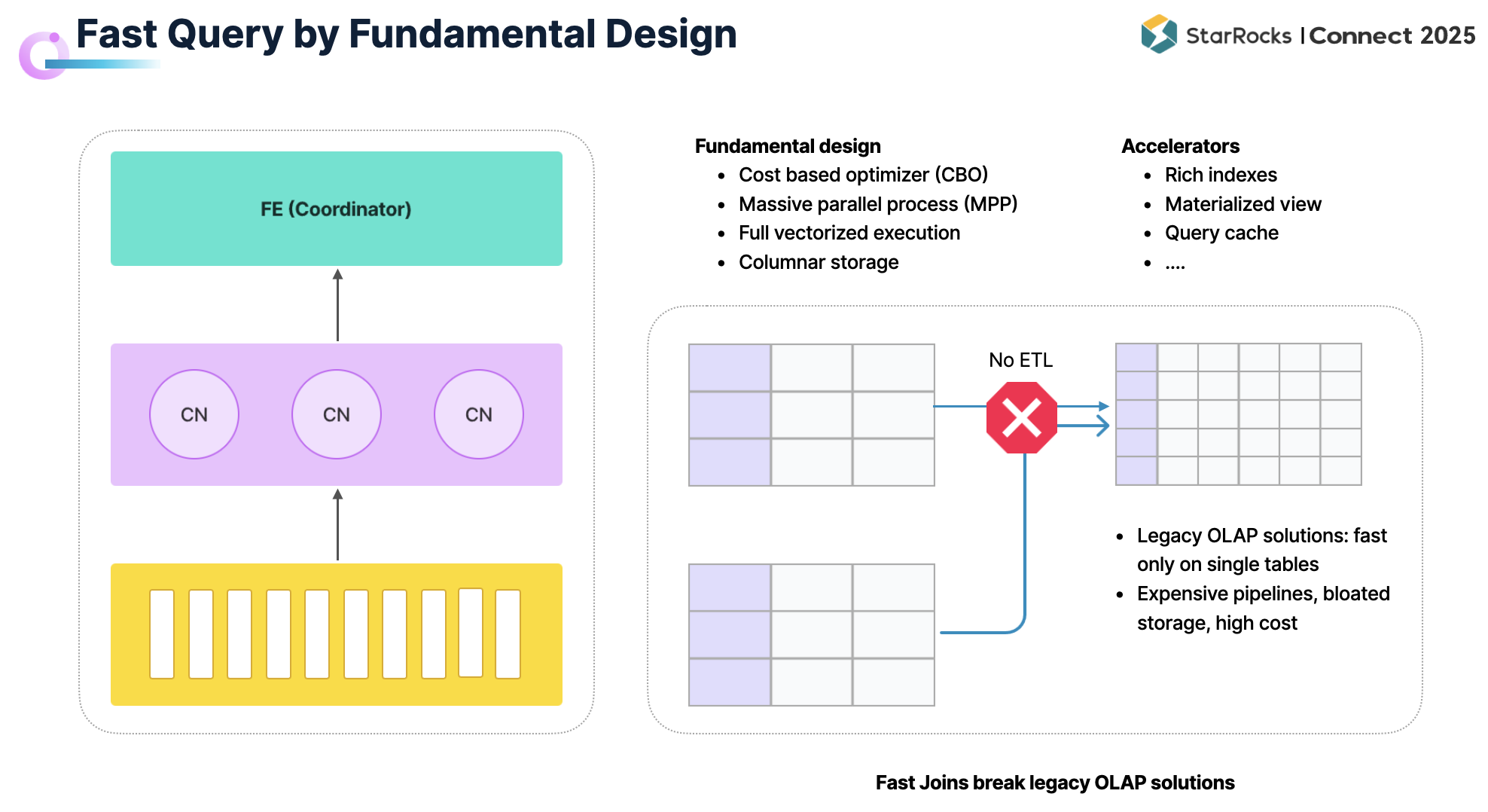 在众多应用场景中,查询延时往往是最核心的指标之一。StarRocks 之所以能够在查询性能上保持优势,主要体现在以下三个方面: