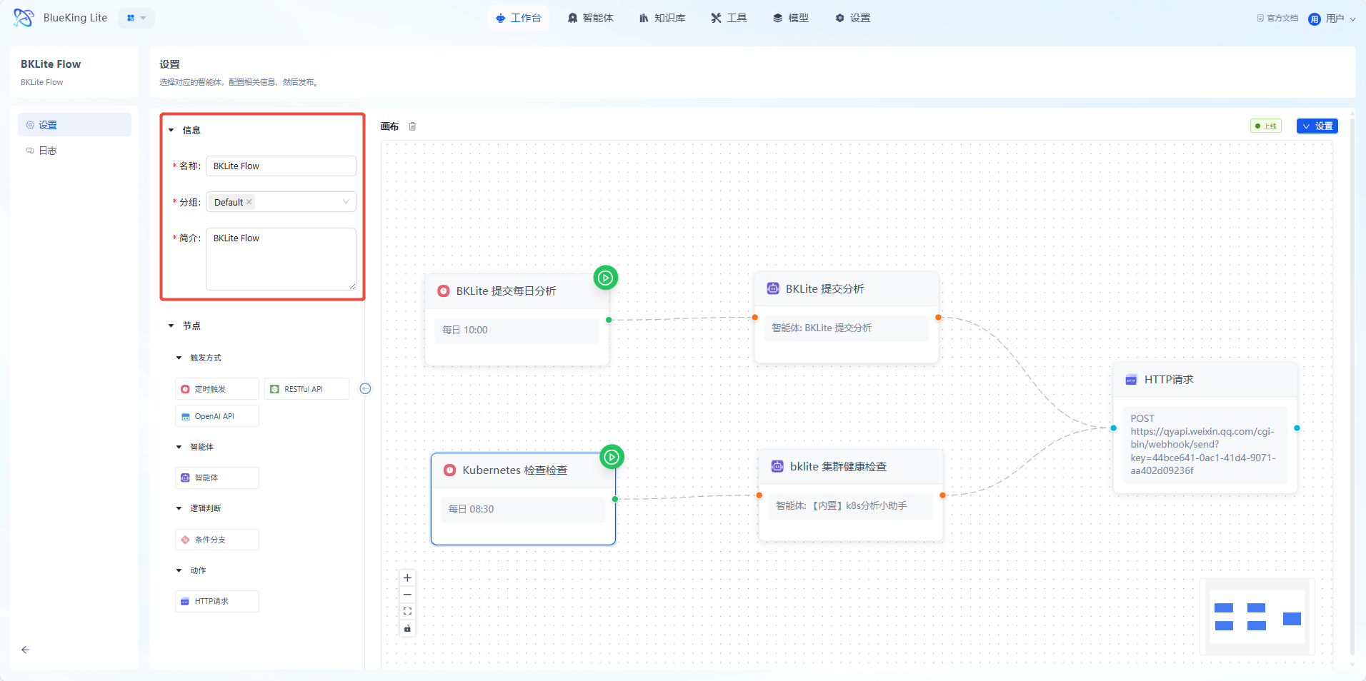 Chatflow 是可视化工作流,通过画布拖拽节点实现流程管理。在“定时触发 K8s 每日巡检”场景中,定时节点设定触发时间,智能体节点调用 K8s 工具包执行巡检,HTTP 请求节点输出结果到指定系统,通过该流程实现每日自动巡检。