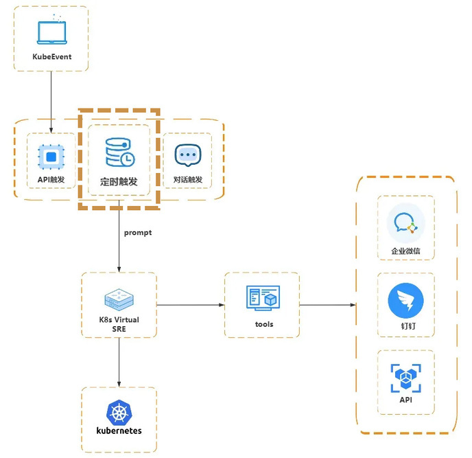 K8s 智能体通过多种触发方式与 K8s Virtual SRE 协同工作,统一协调工具执行与决策。在执行过程中,既能支持人工介入,也能驱动自动化修复,从而实现从触发入口到反馈出口的全链路闭环。