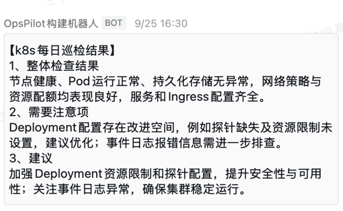 对于 K8s 定时触发得出的巡检结果,机器人会自动整理分析出整体检查结果发送给用户,且根据结果提出需要注意项,并给出加强和优化建议。
