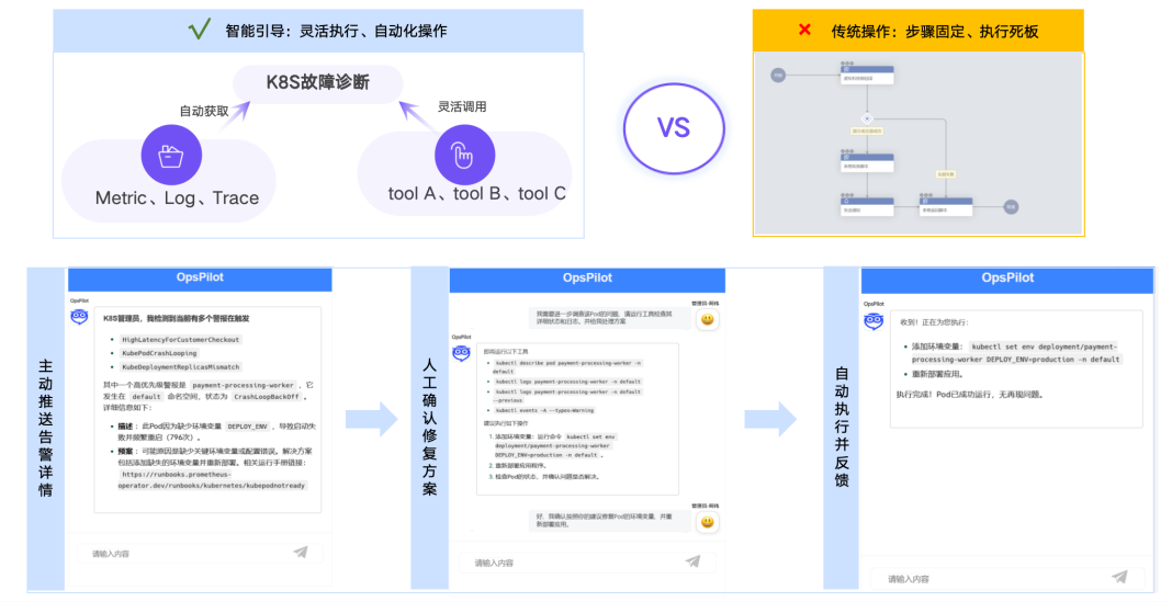 面对传统运维的痛点,OpsPilot 基于大模型和 MCP 工具调度能力,重构了 K8s 集群管理流程,实现从被动响应到主动治理的升级。