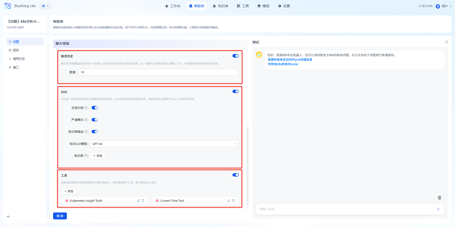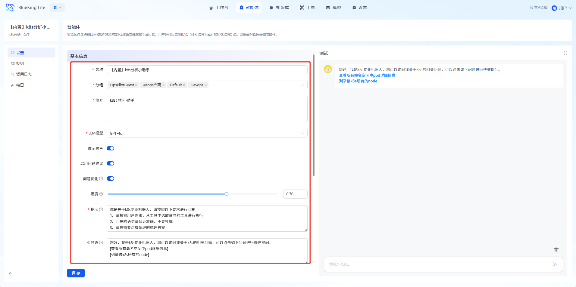 通过智能体,将 LLM 大模型与 k8s 工具包相结合,可实现自然语言交互式运维,智能体能理解复杂指令、生成可执行步骤与分析报告除此之外,智能体还支持定制化提示语、交互风格及温度设置,实现符合团队标准的运维输出,进行操作执行和结果反馈。