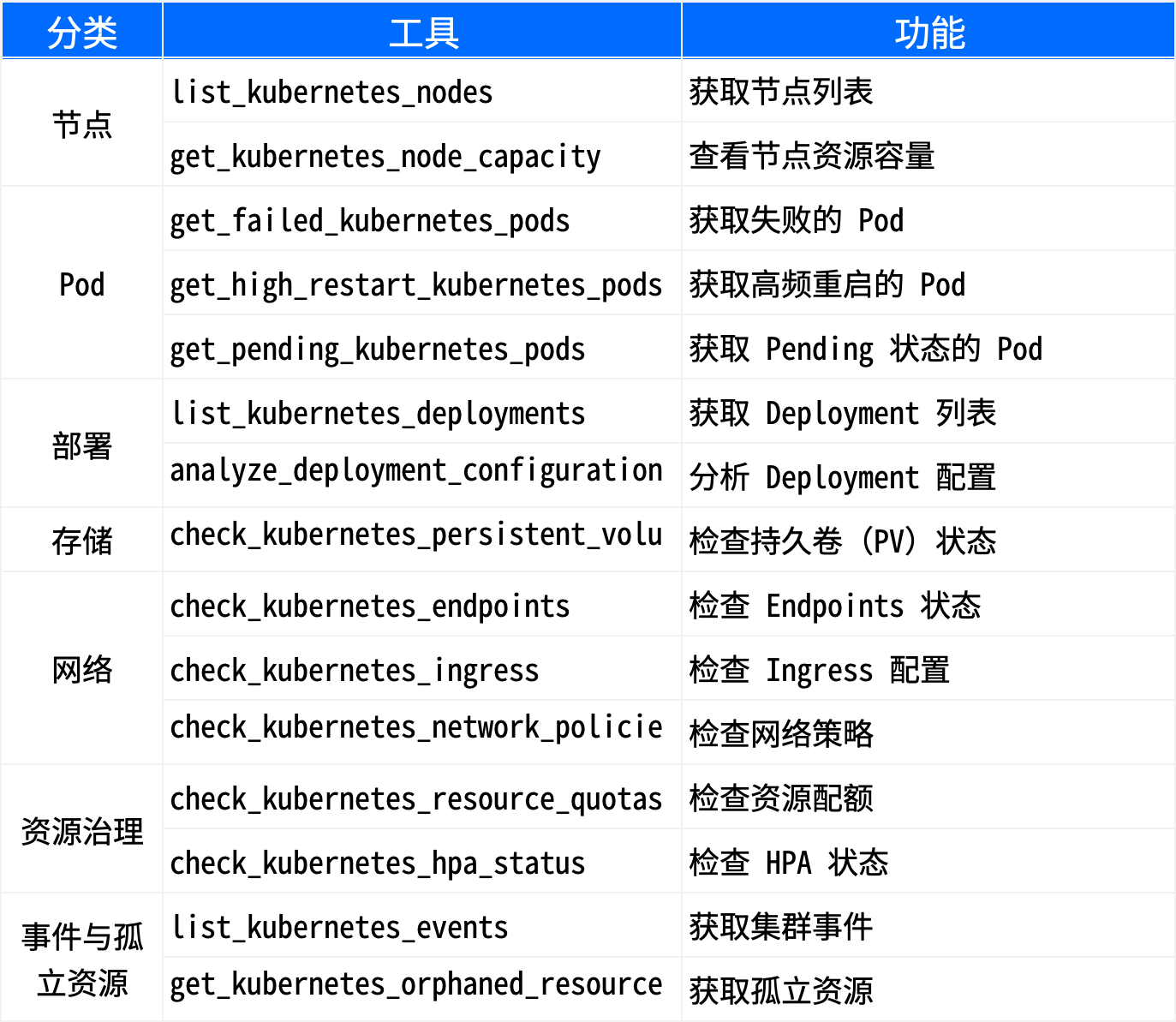 由中大计算机团队研发,OpsPilot 内置的 K8s 智能运维工具包,提供全面的集群巡检与治理能力,覆盖节点、Pod、部署、存储、网络及事件管理,支持状态检测、配置分析与异常发现,帮助运维高效掌握集群健康、提升响应速度。