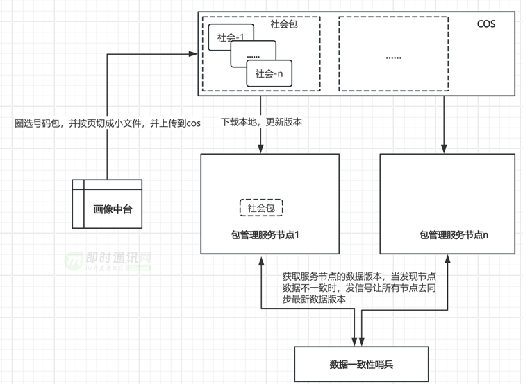 3)集群有个数据一致性哨兵,定期检查集群节点的数据版本,当发现集群数据版本不一致时,给集群所有节点发信号,强制让每个节点同步 cos 上的最新数据,让集群所有节点数据跟最新数据保持一致。