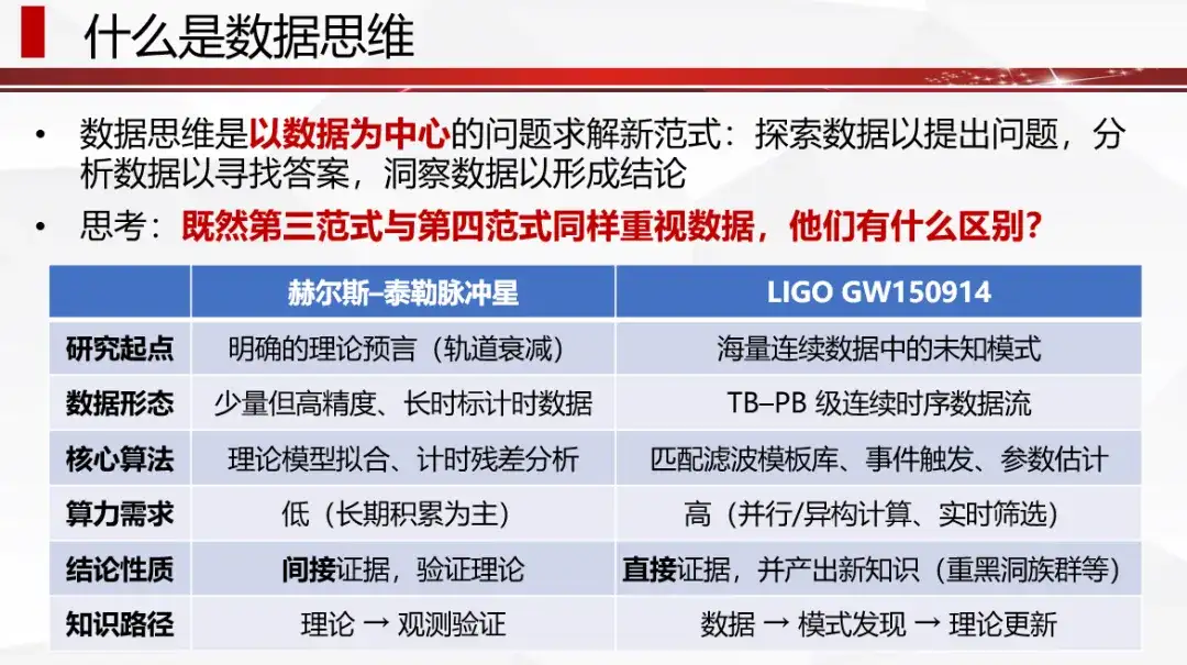 第二个重点,是关于数据科学的特点。我们认同图灵奖得主 Jim Gray 提出的“科学研究的第四范式”,即利用信息技术获取、处理、存储、统计、分析数据以获取知识。数据之所以在当前备受重视,核心在于它开启了一条新的知识发现路径:从海量数据中探索模式以推动理论更新,这与传统的 “理论-观测-验证” 路径相辅相成。