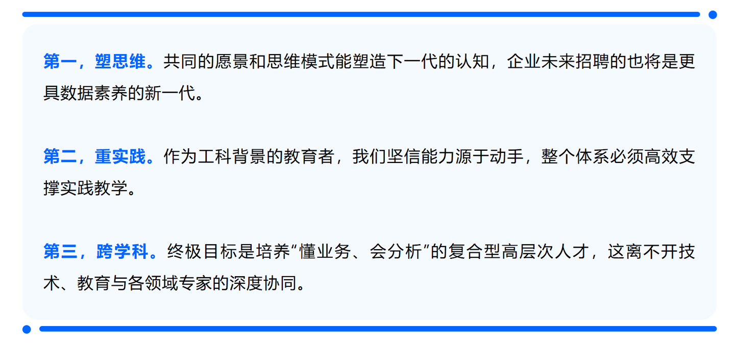 传统教育以理论为中心的经典授课模式为主,而我们现在希望转向以数据为中心的新型范式,这中间存在差距。