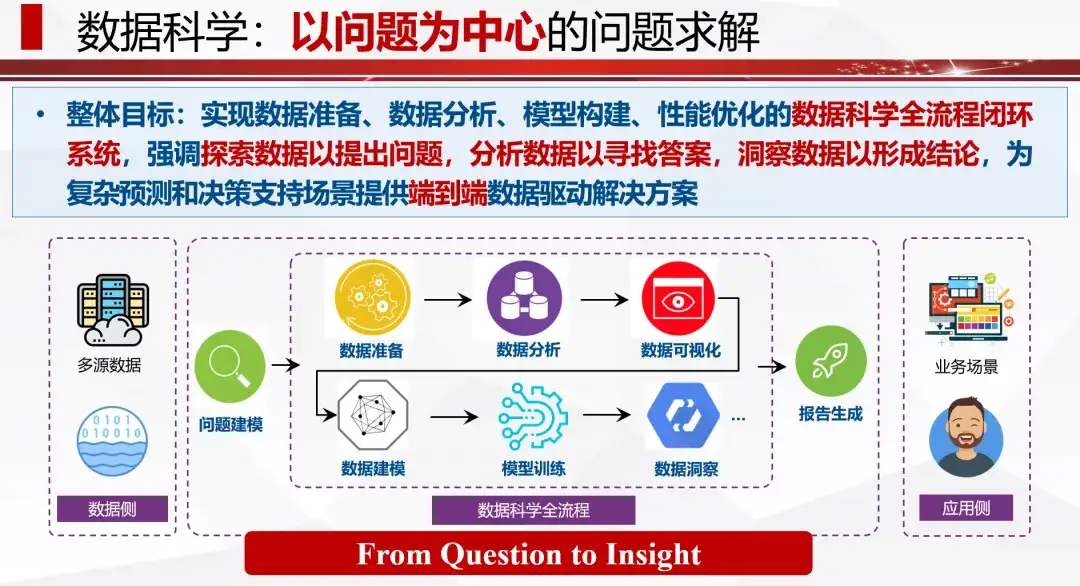 与传统软件开发“需求-设计-测试”的线性流程不同,数据科学强调探索式分析:可能需反复尝试上千次,才能在特定领域发现有价值结论。最终的洞察必须与其专业背景深度融合,并服务于复杂预测与决策场景。而这一切,必须是“端到端”的——不能只优化某个环节,却无法解决真实问题。我们希望通过生态合作,构建以问题为中心、以数据为中心的问题求解体系。