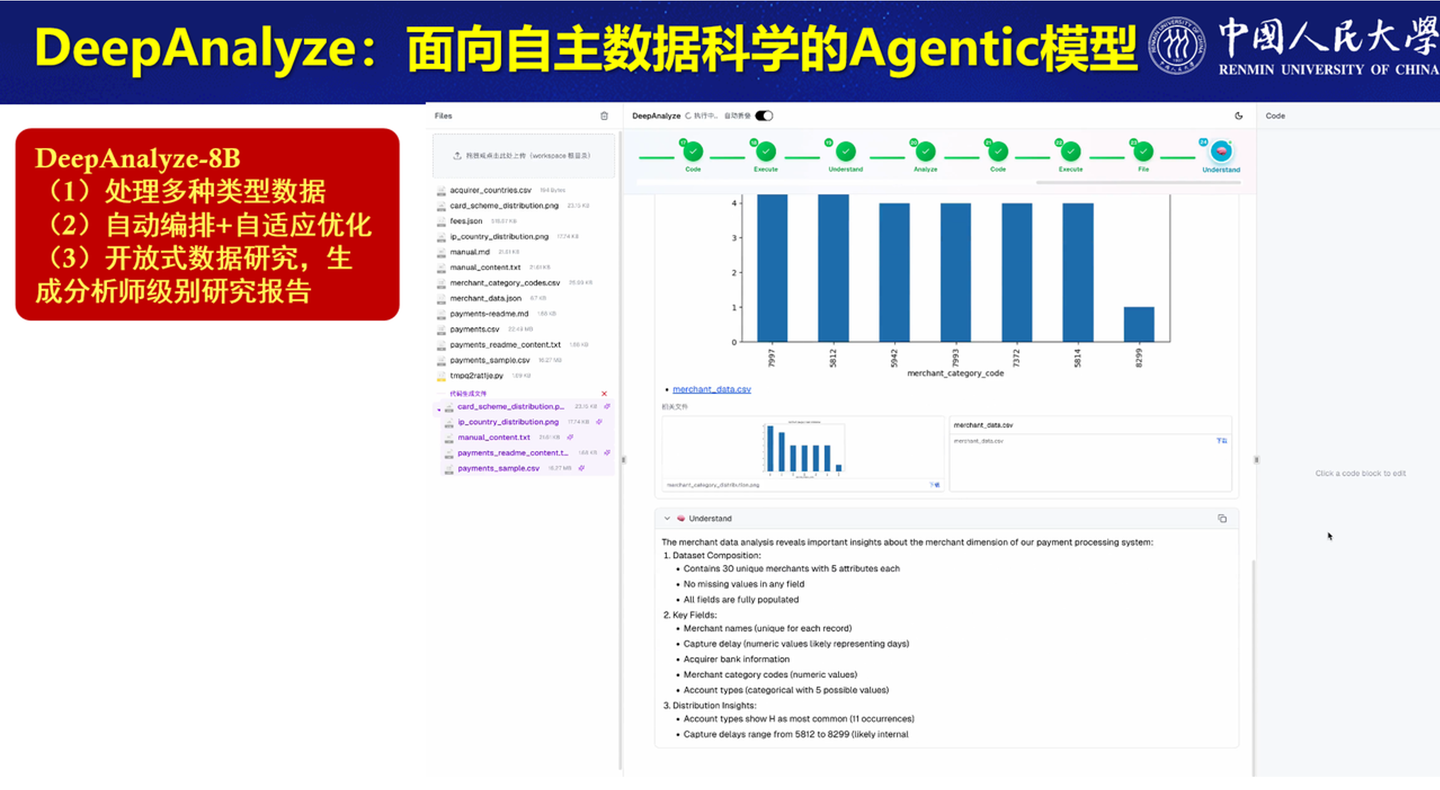 为进一步让人工智能系统自主完成复杂的数据科学任务,约三周前,我们发布了一款数据分析智能体 DeepAnalyze。它能够理解用户意图,自动编写代码、执行数据分析流程、生成可视化图表并撰写分析报告。目前基于一个 8B 参数模型,其主要意义在于保障数据分析的基础水准,确保产出具备一定的基准质量。当前模型水平大致相当于学过《数据科学导论》的大二、大三本科生,深度上还远不及领域专家。
