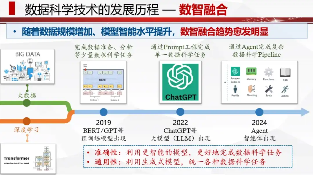 首先,关于课程定位,我们的观点是未来将呈现数智融合的趋势。随着数据规模增长和模型智能水平提升,这一趋势已愈发明显。相关文献调研显示,自 2019 年预训练语言模型出现,已能协助完成部分数据准备工作;到 2022 年左右,提示工程方法能驱使大模型完成更多任务;至 2024 年,智能体的发展让我们处于新范式的前夜,有望通过数智融合方法,追求更高准确性与通用性,为教育和行业提供更好解决方案。