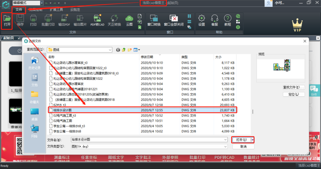 1、启动浩辰 CAD 看图王电脑版,点击【文件】菜单栏中的【打开】功能,选择需要打开的图纸,如下图小编打开了【给排水设计图】,其当前文件大小为 23M,打开的时候就会有些慢。