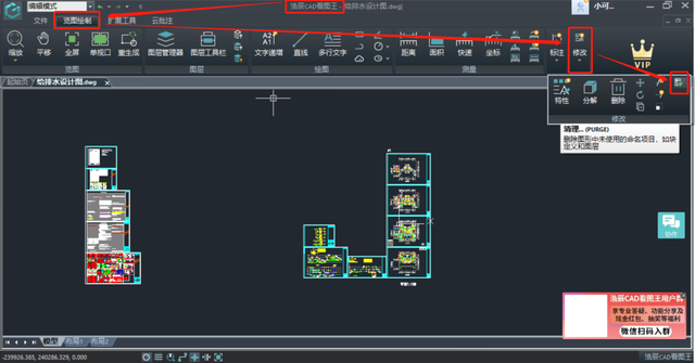 2、为了让 CAD 图纸打开更快速,便需要清理图纸中的冗余文件,此时在软件顶部菜单栏中点击切换至【览图绘制】选项卡,点击【修改】组中的【清理】按钮。如下图所示: