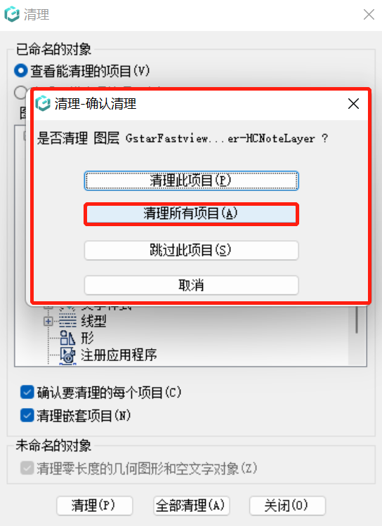 4、此时会弹出【清理-确认清理】对话框,在其中可以根据自身实际需求选择清理此项目、清理所有项目或者跳过此项目以及取消等,如果我们是确认清理的,就选择清理所有项目就可以了。如下图所示: