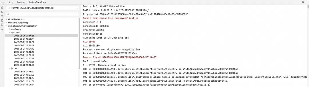 点击触发 CPP 崩溃之后,APP 崩溃。在 DevEco Studio 的 FaultLog 中可以获取到异常堆栈。
