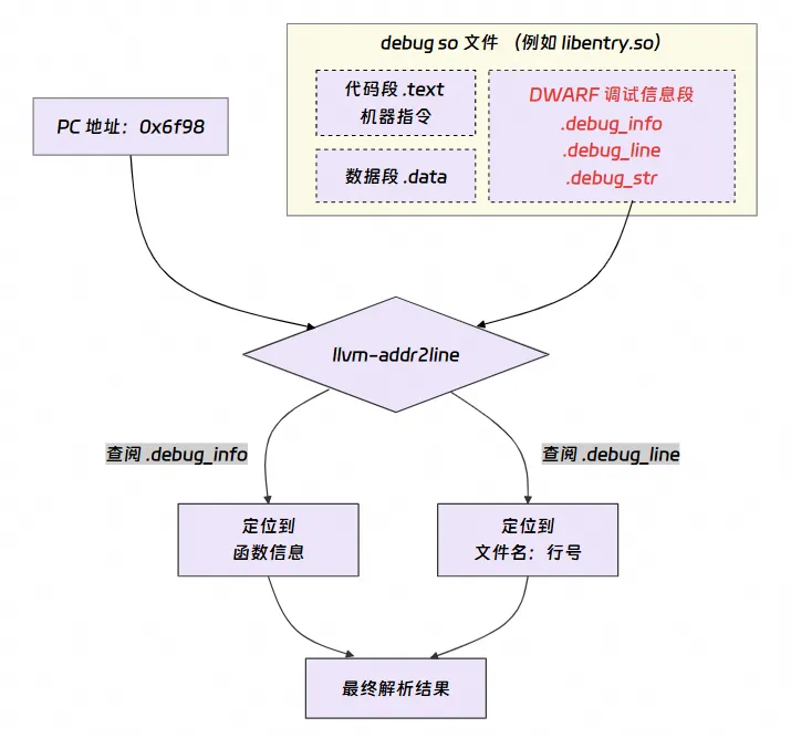 llvm-addr2line 是业内主流的 C++ 堆栈解析工具之一。现在我们深入 llvm-addr2line 内部,它的工作原理在鸿蒙场景下完全适用,核心依赖于编译产物 debug so 文件中包含的两样东西。