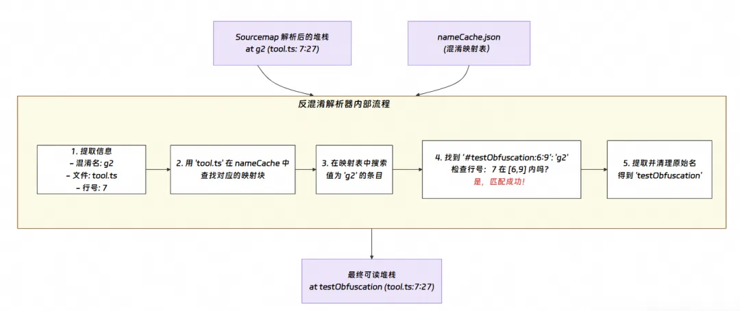 我们可以将反混淆解析视为 Sourcemap 解析之后的第二阶段精加工。Sourcemap 解决了“在哪里”的问题(文件名和行号),而反混淆则解决了“是什么”的问题(函数和变量名)。
