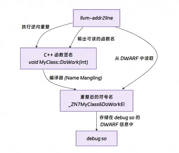 为了支持函数重载等 C++ 特性,编译器会把我们写的函数名(如 OH_NativeXComponent_RegisterCallback)转换成一个唯一的、但不可读的符号名(如 _Z35OH_NativeXComponent_RegisterCallbackP18OH_NativeXComponentP29OH_NativeXComponent_Callback)。这个过程叫名称重整 (Name Mangling)。llvm-addr2line 在 DWARF 信息中找到的就是这个重整后的符号名。为了方便开发者阅读,它会执行一个逆向过程——逆向重整 (Demangling),将其还原为原始的 C++ 函数签名。