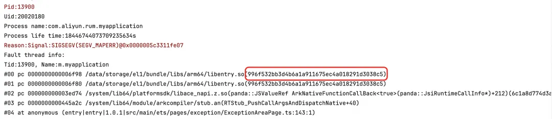/data/storage/el1/bundle/libs/arm64/libentry.so: 动态库路径。指明了崩溃发生在哪一个 .so 文件中。这是设备上运行时的路径。