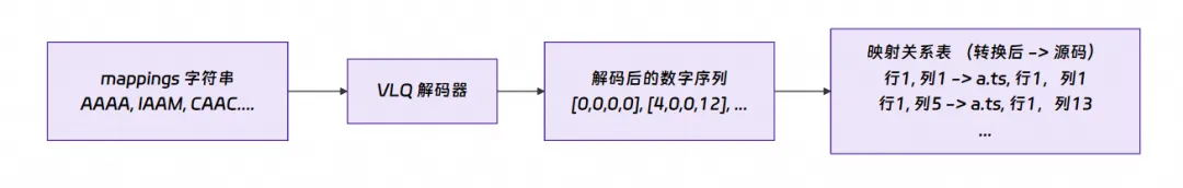 mappings 字段是 Sourcemap V3 规范的核心。它是一长串看起来像乱码的字符串,例如如"AAAA,IAAM,CAAC..."。它并不是乱码,而是使用一种叫 VLQ (Variable-length quantity) 的编码方式,对位置信息进行了极致的压缩。解析器会按特定规则解码这个字符串,从而得到一个从转换后代码(字节码)的行列号到源代码的行列号的完整映射表。
