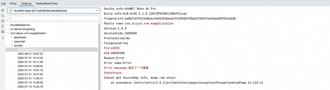 同样地,在 DevEco Studio 的 FaultLog 中可以获取到异常堆栈。
