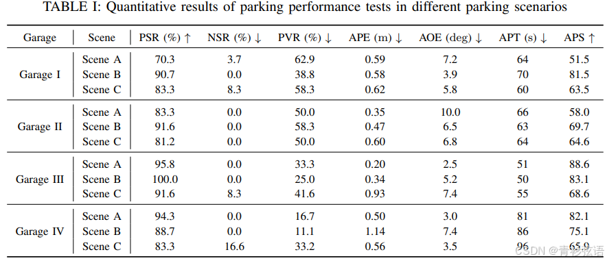 端到端实车评估:在实车实验中,我们使用以下指标来评估端到端停车性能。