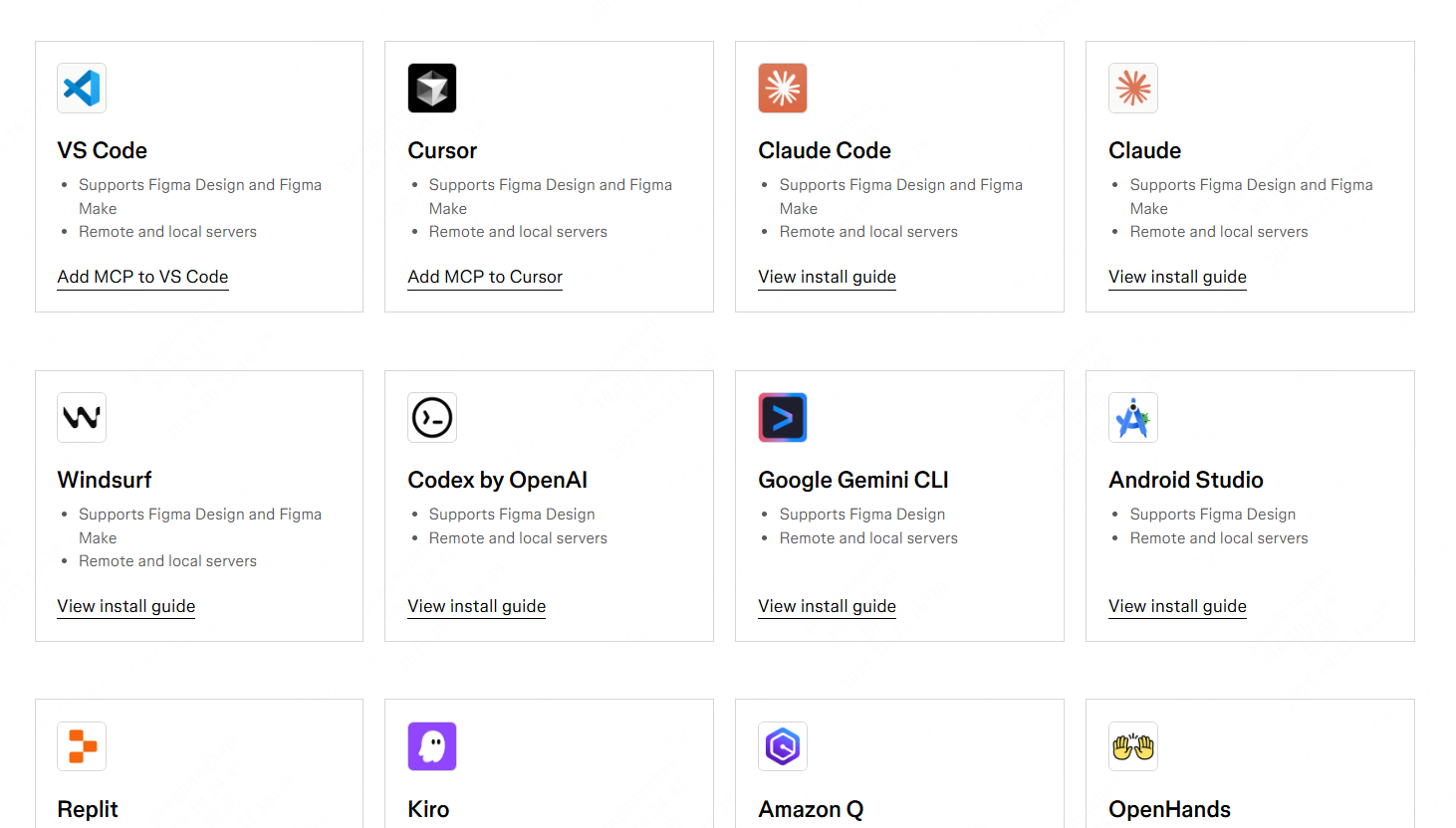 想基于 Figma MCP 实现设计驱动代码生成,还需要另一类重要的“参与者”——MCP 客户端,这类工具主要是各种 AI 编程工具或具备代码生成能力的 IDE(集成开发环境),如 Cursor、Claude Code、Windsurf、Codex、VS Code、Replit 等,具体可查看 Figma 的 MCP 目录页面。