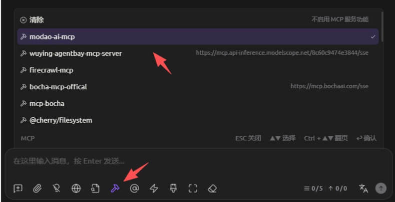 回到 Cherry Studio 的聊天界面,打开 MCP 功能开关。在工具列表中选择刚刚配置好的墨刀 MCP 作为当前使用的工具。这一步完成后,你就已经打通了 Cherry Studio 与墨刀之间的连接通道。