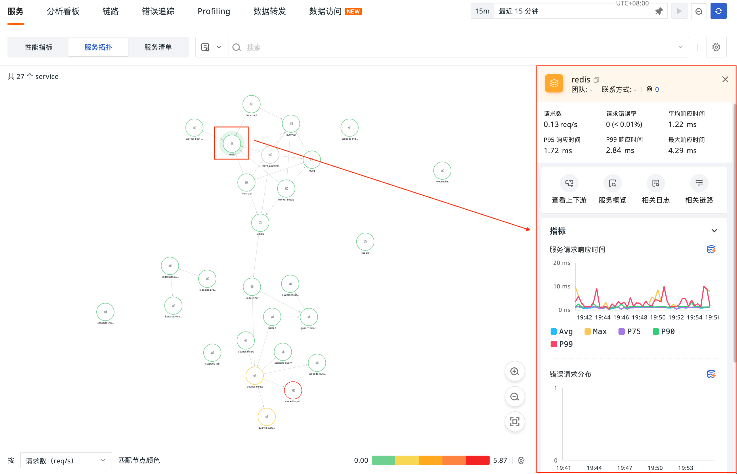 点击节点,新增右侧划对应服务详情,除服务名称、对应团队、联系方式、告警数量、基础指标数据外,展示指标(服务请求响应时间、错误请求分布)和日志(错误日志数)的异常趋势图;