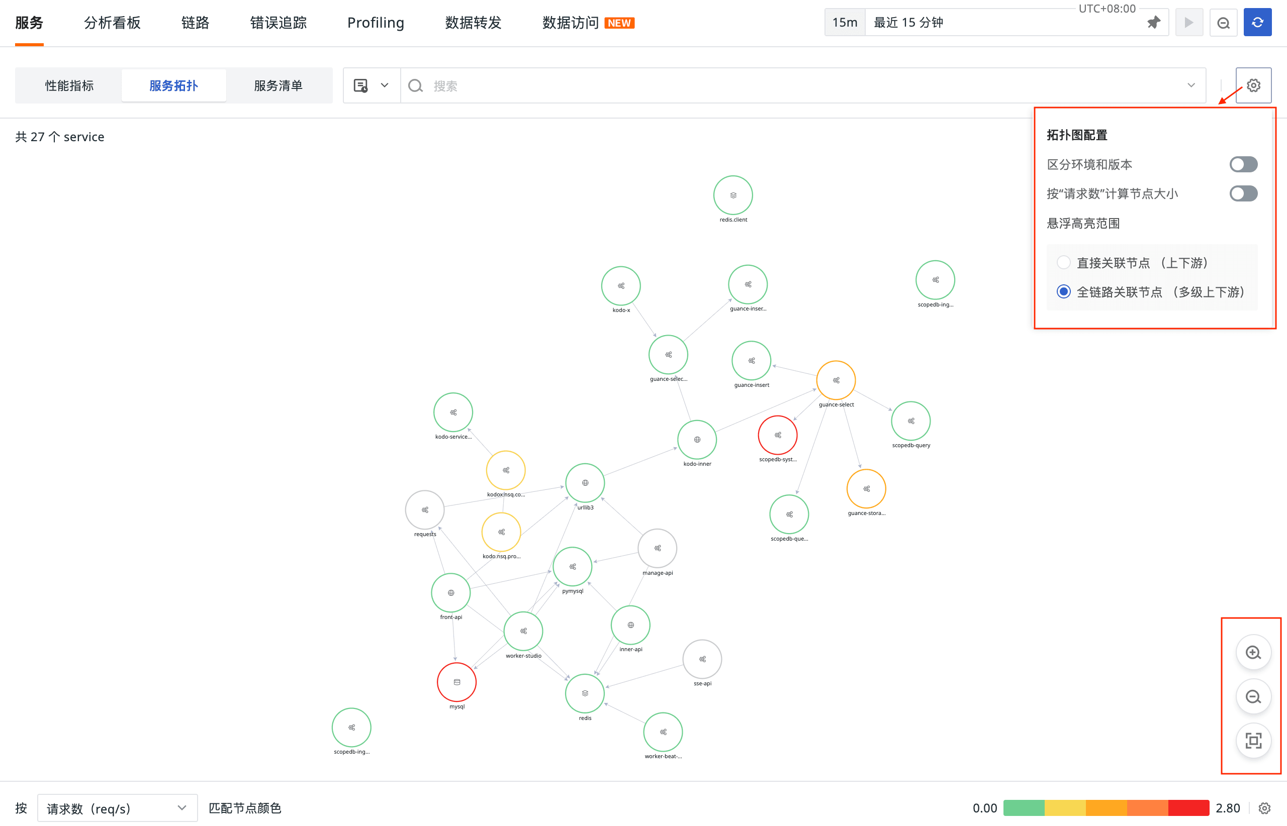 新增拓扑图配置:用户可手动配置是否按“请求数”计算节点大小;用户可选择悬浮高亮范围。