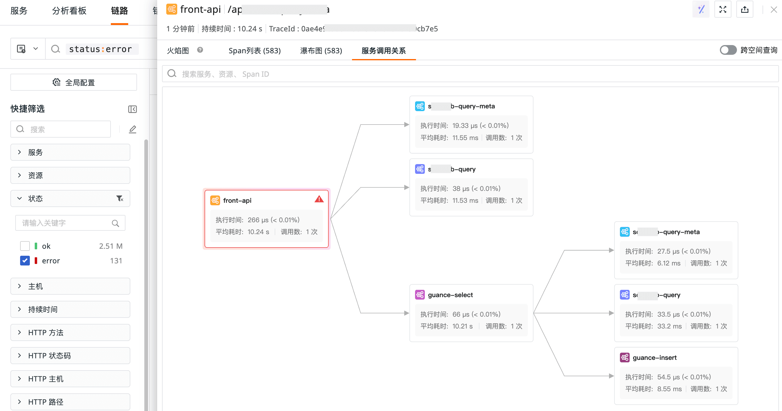 节点信息增强:通过左右结构展示全路径服务调用关系,同时在每个服务节点上,直接展示执行时间、平均响应时间、调用次数、错误信息;点击可查看服的父级 Span,用于追溯上游调用来源;若该服务存在错误,将直接展示错误详情。