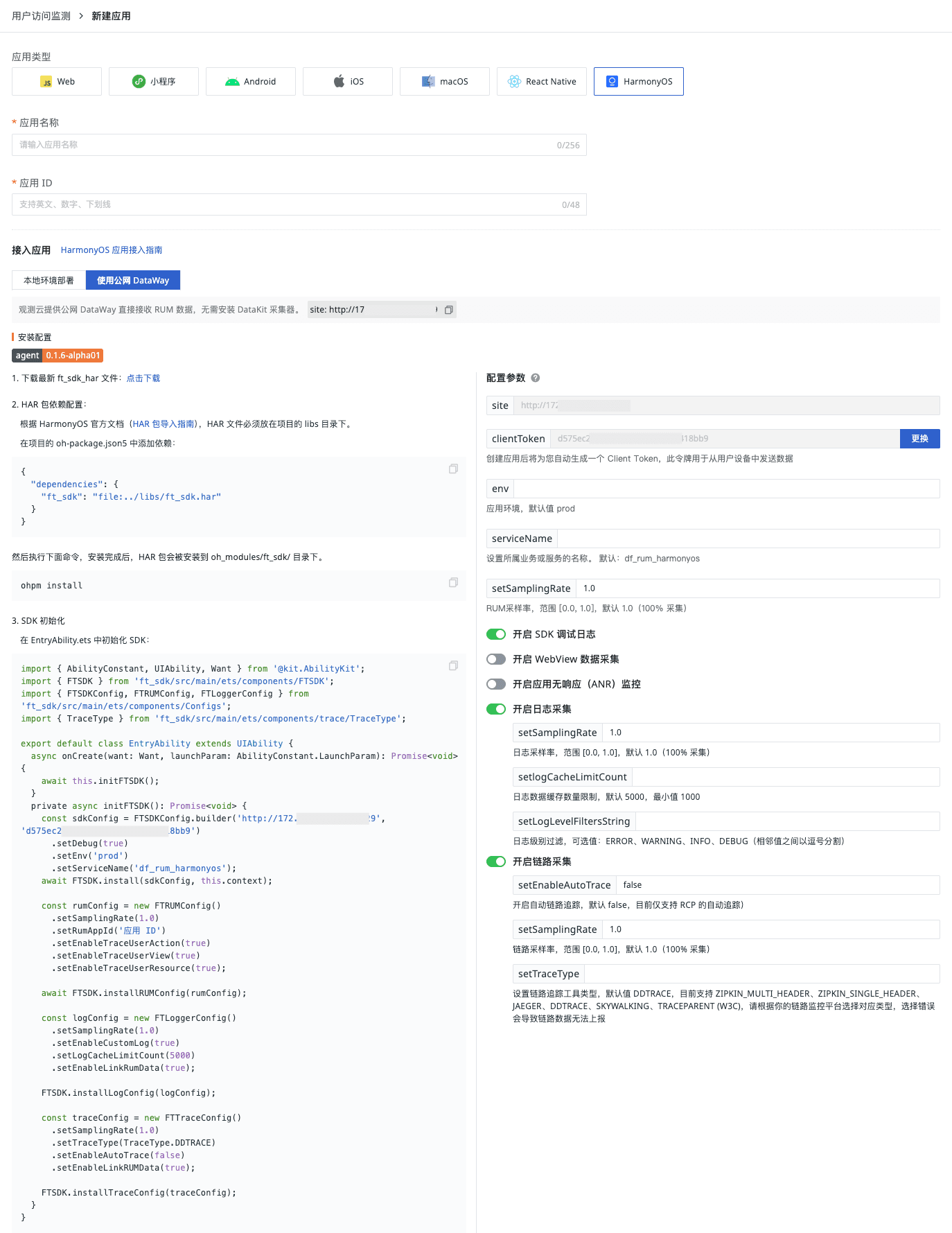 1、为适配鸿蒙(HarmonyOS)生态发展,新增支持应用类型 HarmonyOS。用户可在创建应用时选择 HarmonyOS,并获取对应的 SDK 集成指引与配置支持,实现鸿蒙应用的完整可观测性接入。